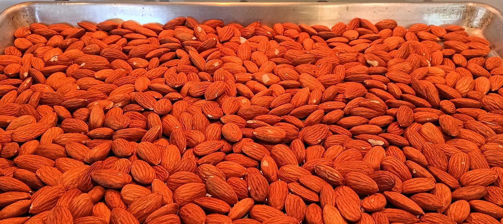 - Heat your oven to 275 degrees convection*. While that is heating, lay your almonds out on a cookie sheet so they are all very close together but not piled up too deep.