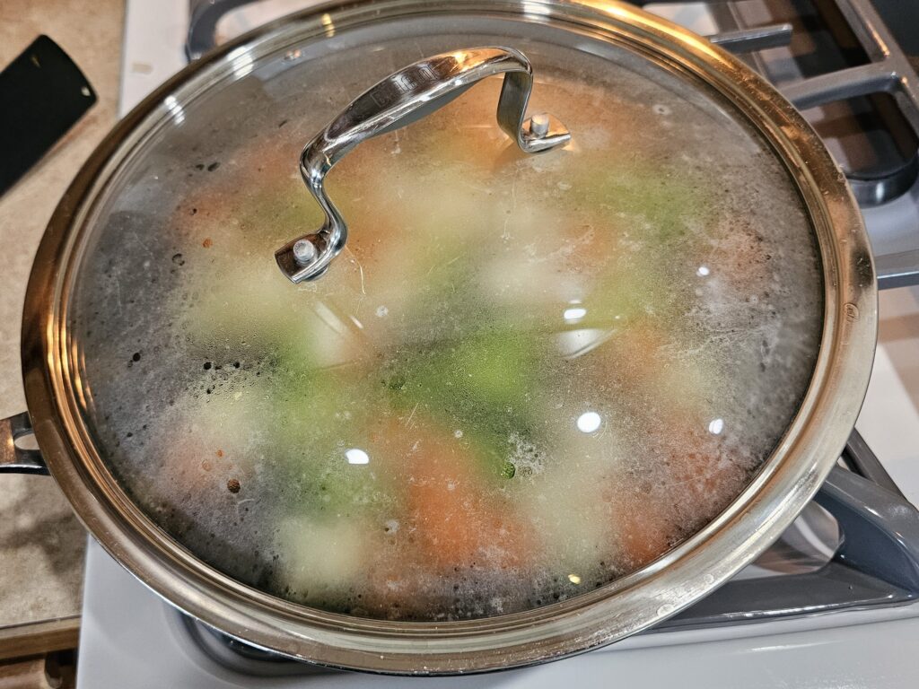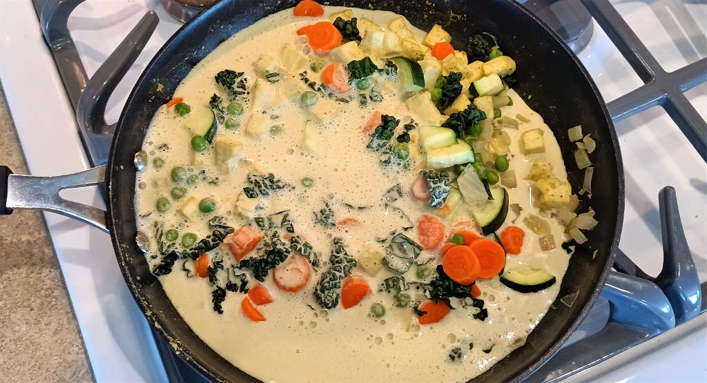 The cream sauce and seasonings blend up quickly.  Don’t cook it with the veggies until you are ready to eat.  It only needs to simmer for a a few minutes to thicken and heat through.