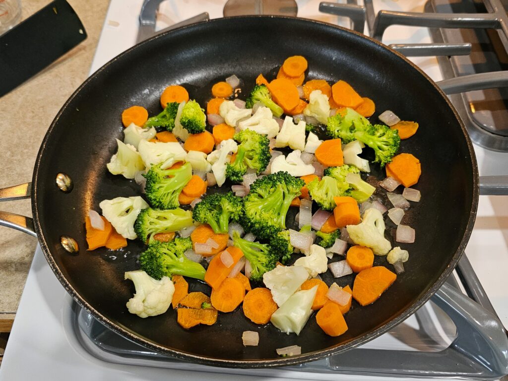 • In the same non-stick pan saute onions, ginger, and garlic until the onions are clear, using small amounts of water as needed. Add the broccoli, cauliflower and carrots to the onions with a small amount of water, cover and steam just until veggies are done to your liking and water is absorbed.
