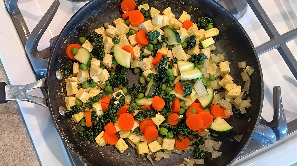 • Rinse and drain tofu and cut into small 1/2″ cubes.  Sauté in a large dry non-stick pan on lower heat until cubes are firm and all moisture is absorbed.  Remove tofu and set aside.